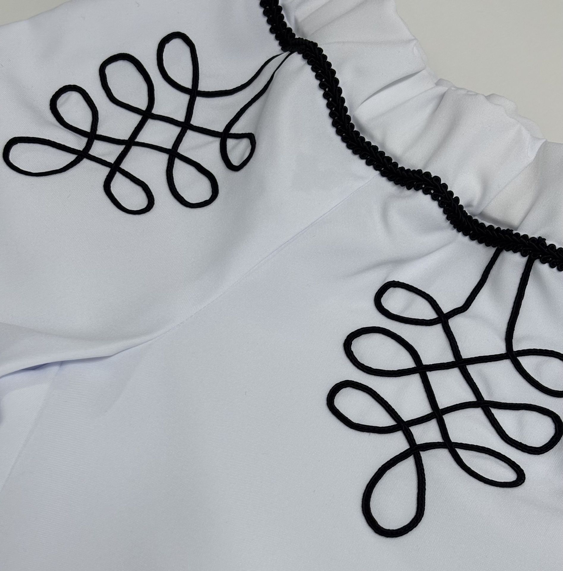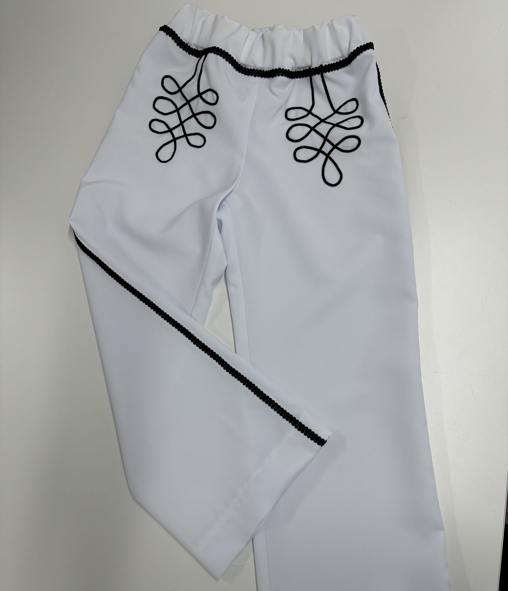 Nohavice sú vpredu zdobené našitou šujtaškou, po bokoch a okolo pása je ozdobný prámik.